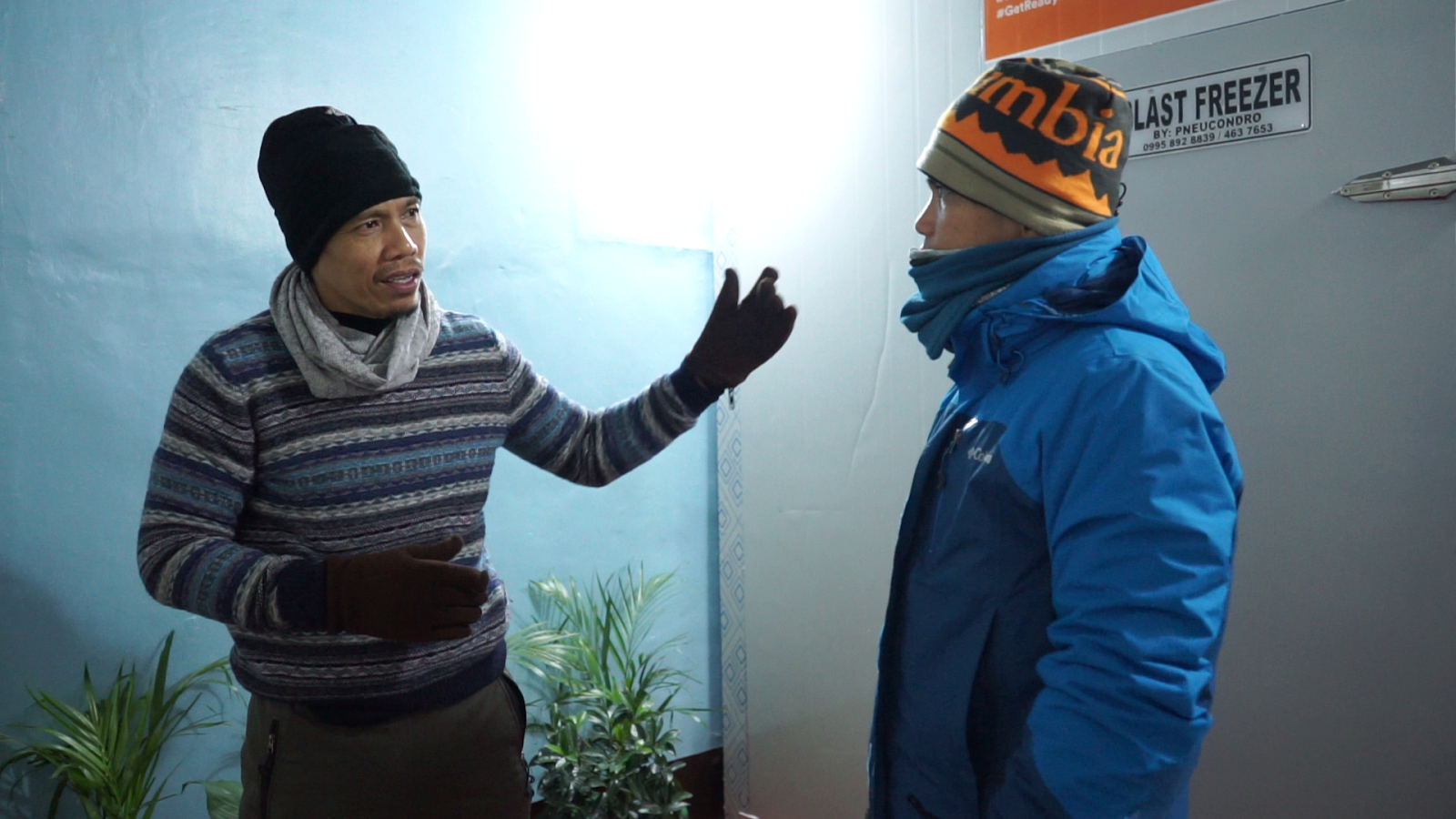 Romi Garduce giving valuable advice and tips to Louie Sangalang on how to survive the extreme cold.